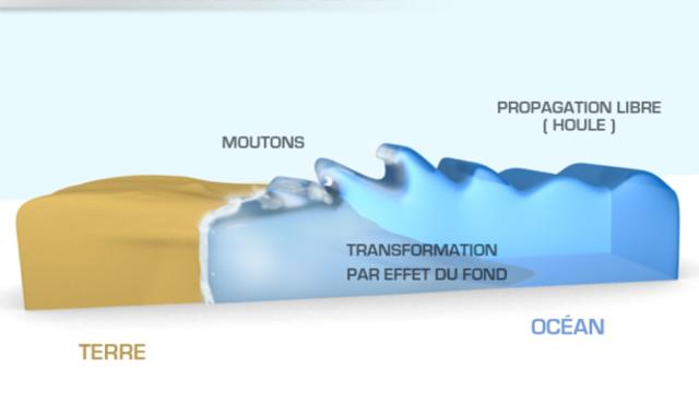 Par la suite, plus la houle s’approche des côtes, plus sa courbure s’accentue. Cette transformation est due à la diminution de la profondeur qui a pour conséquence de faire basculer l’eau de surface en avant en avant, une sorte de croche-pied.