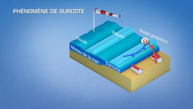 Rappelons tout d’abord que le phénomène de surcote consiste en une variation locale et temporaire du niveau de la mer provoquée par les variations du vent et de la pression atmosphérique.