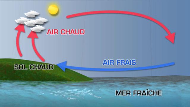 A cette époque de l'année, la température de la mer est plus fraîche que celle des terres, fortement réchauffées par le soleil. Résultat, l'air chaud dans les terres s'élève naturellement (il est léger) et se trouve remplacé par de l'air beaucoup plus frais venu de la mer. Cet air frais est advecté par un vent venu de la mer qui souffle en moyenne à 10 ou 20 km/h et qui a pour effet de rafraîchir les zones littorales. On parle de brise de mer.
