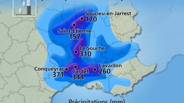 En début de mois, les conditions anticycloniques dominent mais le temps se dégrade nettement à partir du 6 avec le début d’un épisode méditerranéen qui donne de très fortes intensités pluviométriques sur les départements du Gard, de l’Ardèche et du Vaucluse. A Conqueyrac (30) on recueille 308 mm en 7 heures dans la nuit du 6 au 7 septembre ! A Cavaillon (84), il tombe 202 millimètres en 4 heures et 260 mm en 24 heures. Par ailleurs, on relève en 24 heures, 159 mm à Avignon, 164 mm à Nîmes, 236 mm à Aubenas (07), 275 mm à Lablachère (07) et jusqu’à 355 mm à Cardet (30). Au cours de la journée du 7 septembre, de très fortes précipitations concernent aussi le Stéphanois et le Lyonnais. Un record de précipitation est même battu à la station de Lyon-Bron avec 113 mm en 24 heures (l’ancien record datait du 30 septembre 1958 avec 89 mm). Record de pluie aussi à Saint-Etienne où l’on recueille jusqu’à 157 mm à la station du centre-ville. Le cumul de pluie le plus important est de 170 mm à Soucieu-en-Jarrest (69). Le 8 septembre des pluies parfois marquées se produisent dans l’extrême nord avec 42 mm à Méaulte (80) et 56 mm à Saulty (62). Au cours de la deuxième décade les précipitations restent modestes. On observe tout de même quelques averses orageuses le 12 dans le nord-est et notamment 37 mm à Strasbourg. Le 17, des pluies orageuses concernent l’est des Pyrénées avec 33 mm à Serralongue (66) et 37 mm au Tech (66). En dernière décade, une perturbation active traverse la France entre le 23 et le 24 et donne parfois des cumuls de pluie importants : 34 mm à Joigny (89), 38 mm à Besançon (25), 40 mm à Guéret (23), 46 mm à Figeac (46) et jusqu’à 65 mm à Château-Chinon (58). Le 26, de fortes pluies concernent les régions situées au nord de la Seine avec 21 mm à Compiègne (60), 25 mm à Buhy (95), 34 mm à Bouelles (76), 38 mm au Touquet et même 62 mm à Rouvroy-en-Santerre (80). 3. L'ensoleillement.