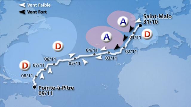Après 9 jours de traversée de l'Atlantique, depuis Saint-Malo le 31 octobre, Franck Cammas à bord de son multicoque Groupama 3 est arrivée mardi après-midi à 16h (heure française) à Pointe-à-Pitre en Guadeloupe. La météo a été moins favorable que la précédente route du Rhum où Lemonchois avait pulvérisé tous les records avec une traversé en un peu plus de 7 jours. Revenons sur la situation météo rencontré par Franck Cammas au cours de sa traversée.