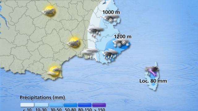 Avec l'altitude, la neige remplacera la pluie dès 1200 mètres en moyenne. Le massif du Mercantour sera plus particulièrement touché, et l'accès à Isola 2000 pourra être contrarié... D'une manière générale, on attend entre 15 et 30 cm de neige au-dessus de 1600 mètres et localement 50 cm près de la frontière italienne. Sur le relief corse la situation sera délicate avec des chutes de neige importantes (jusqu'à 50 cm également sont possibles sur les reliefs centraux de l'île).
