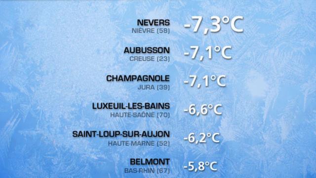 * -7,3°C à Nevers (58) * -7,1°C à Aubusson (23) * -7,1°C à Champagnole (39) * -6,6°C à Luxeuil (70) * -6,2°C à Saint-Loup-sur-Aujon (52) * -5,8°C à Belmont (67)