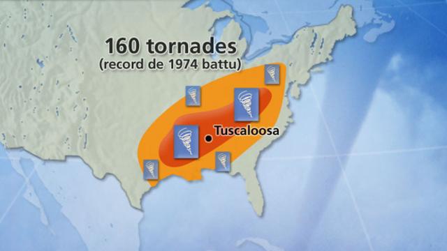 C'est vraiment depuis hier que la situation est devenu très critique sur un axe allant du Mississippi à la Virginie. Un nouvel outbreak est en cours puisque 160 tornades ont déjà été recensées. La plus violente, une F5 avec des vents supérieurs à 400 km/h, a touché la ville de Tuscaloosa en Alabama.