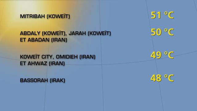 49°C à Koweit city, Omidieh (Iran) et Ahwaz (Iran)