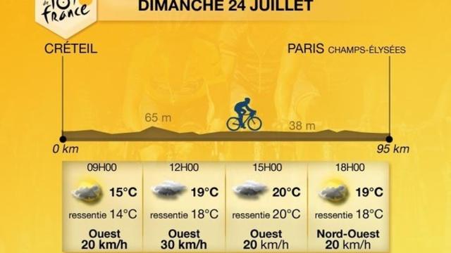 Cette dernière étape du Tour de France cycliste se déroule entre Créteil et les Champs Elysées à Paris. L'arrivée des coureurs se déroulera sous une météo calme mais les nuages seront nombreux. Néanmoins on n'attend pas de pluie ni d'averse tout au long du parcours.