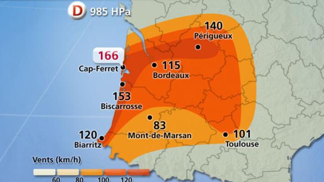 C'est vers 6h du matin que les premières bourrasques ont déferlé sur la côte aquitaine, de la Gironde au pays basque. La tempête a ensuite progressé dans les terres en gardant toute sa violence sur le nord de l'Aquitaine, où les rafales ont atteint les 140 km/h, y compris dans les zones urbaines. Ensuite, cette dépression très creuse s'est décalée vers le Limousin en faiblissant, mais là aussi on a mesuré de 90 à 110 km/h.