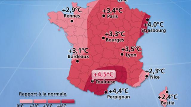 Quant à l'ensoleillement, il est très excédentaire, notamment des Pyrénées aux frontières de l'Est (+30% par rapport à la normale).