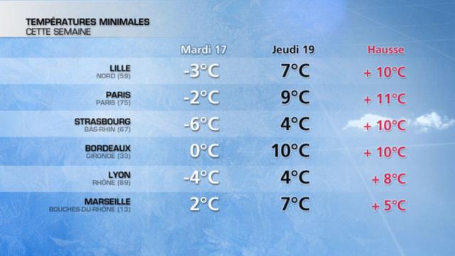On attend par exemple 7°C à Lille, 9°C à Paris ou encore 10°C à Bordeaux, soit une hausse de près de 10 degrés en moins de 48 heures ! Ensuite, les valeurs baisseront à nouveau un peu à l'approche du week-end, vers des températures de saison. Les gelées resteront toutefois rares car le ciel sera souvent chargé et l'humidité bien présente. La semaine prochaine s'annonce plutôt douce, sans gel.