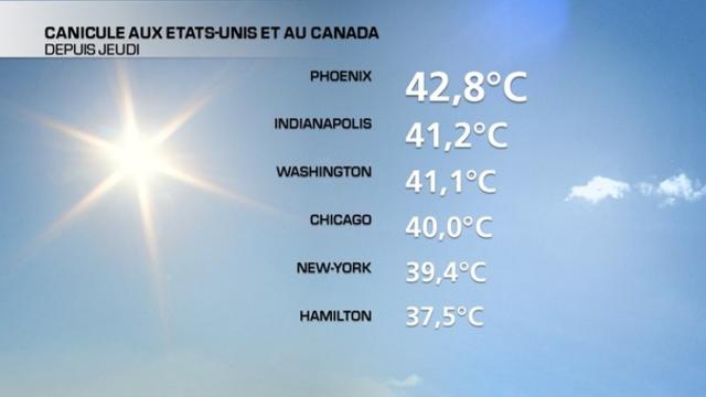 La canicule a même atteint la région des Grands Lacs ; la barre des 40°C a même été approchée à Chicago vendredi ; pour cete dernière ville, on a frôlé le record absolu de chaleur du 24 juillet 1934 avec 40,5°C.