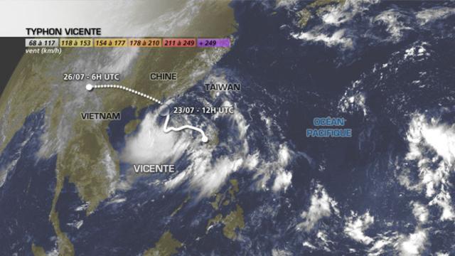 Sa trajectoire est préoccupante car Vicente est devenu un typhon de catégorie 1 et le sera toujours au moment de son point d'impact sur les côtes chinoises, dès ce mardi. C'est la province du Guangdong qui est menacée, notamment la région de Yangjiang. Une forte houle cyclonique, des vents à plus de 150 km/h et de très abondantes précipitations (jusqu'à 500 mm) sont attendus. Vicente se dissipera ensuite dans les terres de cette région montagneuse.
