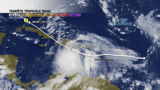 La tempête tropicale est rentrée à présent dans la mer des Caraïbes. Même si les conditions en altitude ne sont pas optimales, elle profitera des eaux chaudes pour se renforcer légèrement. Surtout, sa trajectoire menace directement la République Dominicaine et surtout Haïti, un pays très vulnérable aux aléas climatiques. Son impact est prévu dans le courant de la journée, avec des rafales possibles jusqu'à 140 km/h mais surtout de très fortes pluies susceptibles de produire de très graves inondations (jusqu'à 600 mm en zone de montagne). Isaac sera en limite de l'ouragan de catégorie 1.