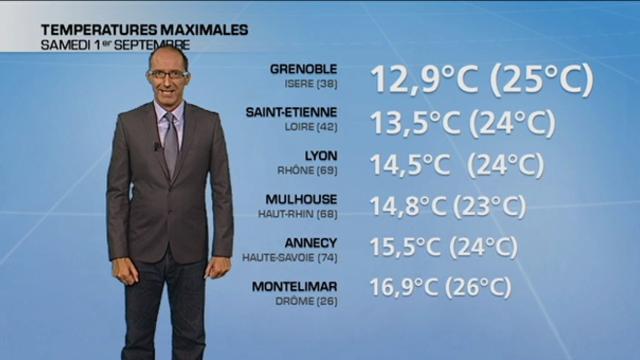 Vendredi après-midi, un coup de fraîcheur s'est abattu en Rhône-Alpes avec des températures inférieures de 10 à 15°C aux moyennes de saison. A Grenoble, avec 14,2°C, il s’agit de la température maximale la plus basse enregistrée pour un mois d’août. Et hier à nouveau, la fraîcheur est restée de mise de la région Rhône-Alpes à l’Alsace en passant par le Jura. La ville de Grenoble a à nouveau fait parler d’elle hier après-midi puisqu’on a relevé 12,9°C ; il s’agit du 1er septembre le plus frais jamais enregistré pour la préfecture de l’Isère.