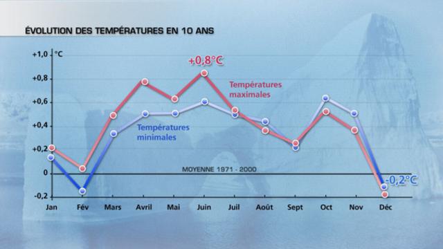 A l’échelle du pays, nous avons gagné en l’espace de 10 ans 0,4°C. Cela confirme la hausse moyenne, proche de 0,5°C, observée à l’échelle mondiale. Toutefois, cette évolution n’est pas homogène au fil de l’année, puisque certains mois ont connu un réchauffement beaucoup plus net que d’autres. L’hiver n’a par exemple connu aucune évolution significative. Décembre est même le seul mois à s’être légèrement refroidi (-0,2°C), en raison notamment de 2010, l’un des plus froids de ces 25 dernières années.