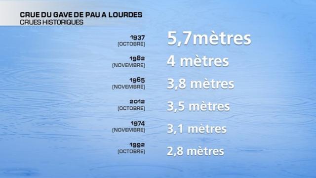 Ces fortes pluies s'abattant sans discontinuer sur les Pyrénées Occidentales (cf° notre communiqué spécial en cours concernant les fortes pluies dans le Sud-ouest) ; elles provoquent une augmentation très rapide des débits des cours d'eau descendant de ce massif qui ont réagi très brutalement, avec comme conséquence la crue de certains d'entre eux, dont le Gave de Pau qui a débordé de son lit et dépassé de 1 mètre sa côte d'alerte pour inonder les quartiers bas de la ville de Lourdes. Il s'agit de l'inondation la plus grave depuis 1937 qui avait été la crue millénaire du Gave de Pau qui avait alors atteint la cote de 5m70 contre avec 3m49 pour cet épisode.