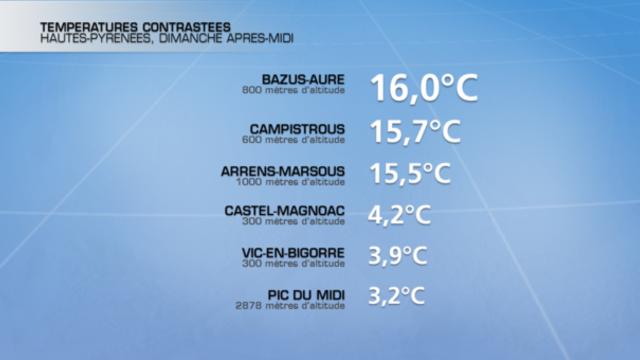 L'air froid par densité stationne dans les fonds de vallées alors que de l'air plus doux se maintient en altitude, notamment entre1300 mètres et 2000 mètres. Ainsi dans les Hautes-Pyrénées on relevait cet après-midi de 3 à 5°C sur le nord du département situé en plaine (entre 100 et 300 mètres d'altitude) plongé sous une épaisse grisaille contre 16°C vers 1200 mètres d'altitude où le soleil régnait en maître.