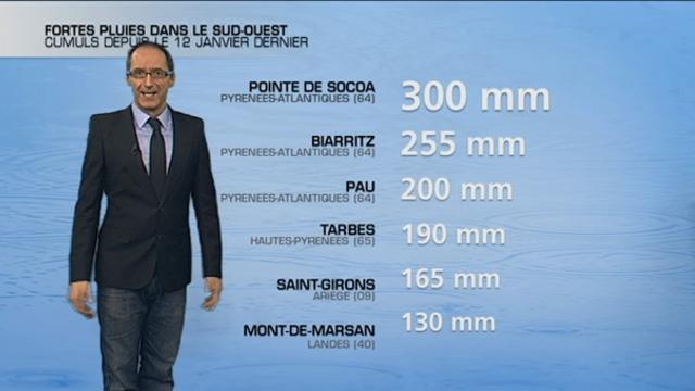En plaine, s'il n'a pas neigé en raison de températures qui resteront relativement douces, il est néanmoins tombé sur de nombreuses villes entre 150 et 300 mm de pécipitations, de Biarritz à Mont-de-Marsan en passant par Saint-Girons. En un peu plus de 10 jours, il est donc tombé par endroit l'équivalent de plus de deux mois de pluies ! A la pointe de Socoa, on a mesuré en 15 jours l'équivalent de 6 mois de pluies sur Paris...