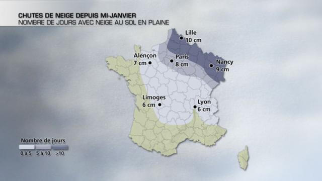Ce froid ne s'est pas non plus accompagné d'un temps sec dans l'Est où des chutes de neige ont été fréquentes (cf° première carte à gauche). Dans le Nord-Pas-de-Calais, le sol est recouvert de neige depuis 13 jours (on est cependant loin des 20 jours de présence de neige au sol de décembre 2010 !).