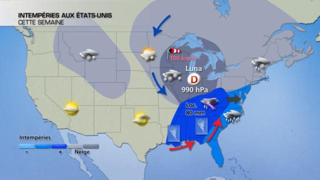Luna remonte en direction des Grands Lacs jusqu'à jeudi, et provoque un contraste de températures remarquable. Le flux s'oriente franchement au sud à l'avant, tandis qu'une descente d'air polaire est attendue sur le centre des Etats-Unis. En conséquence, deux phénomènes majeurs seront à surveiller.