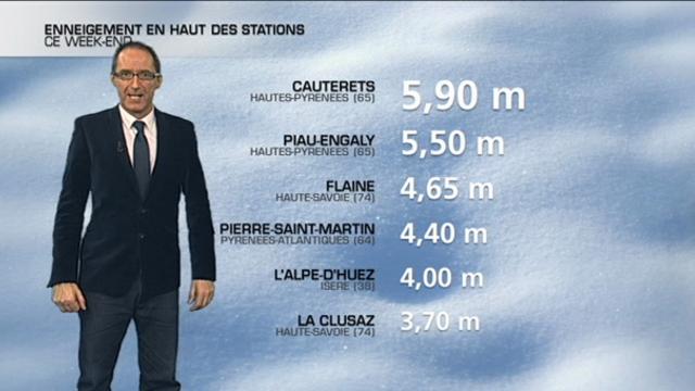 En se dirigeant vers les Pyrénées-Orientales, la semaine dernière a été particulièrement riche en neige puisqu'il est tombé en moyenne de 50 centimètres à 1 mètres de neige en Cerdagne-Capcir vers 2000 mètres d'altitude avec un très fort risque d'avalanche. A Formiguères (66), on relève en hat des pistes 3,50 m, 2,90 à Guzet-neige (09), 2,75 m à Isola 2000 (06), 2,40 m aux Rousses dans le massif jurassien, 1,85 m au Mont-d'Or dans le Massif-Central
