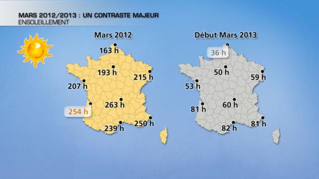 Au niveau de l'ensoleillement, le nombre d'heures de soleil en cette mi-mars est jusqu'à présent faible comparé au mois de mars 2012 qui avait été hors norme et même historique puisque pour certaines villes du nord de la France, le mois de mars 2012 a été le mois le plus ensoleillé de l'année, et ce malgré la faiblesse de la durée du jour...