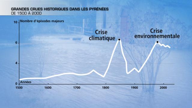 Depuis les années 2000, on note une récurrence d'épisodes violents dans le sud-ouest et notamment dans les Pyrénées : une augmentation de la pluviométrie et des chutes de neige sur la chaine est responsable de ces événements, mais, à la différence de la " crise climatique " du 17 ème siècle, nous assistons depuis notre époque contemporaine à une " crise environnementale " liée à une utilisation de l'espace plus pressante (urbanisation dans les fonds de vallée, impacts des domaines skiables...) qui accroissent la vulnérabilité face aux aléas.