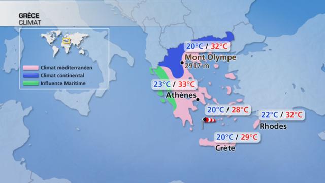 On peut certes affirmer que la Grèce bénéficie d'un " pur " climat méditerranéen, sec et chaud en été. Cependant, il convient de noter quelques nuances : le relief montagneux du nord et du centre de la Grèce est caractérisé par de fortes chaleurs en journée mais les nuits sont plus respirables grace à l'altitude. Les montagnes au nord de Thessalonique accrochent davantage les orages, tandis que les montagnes du sud (Péloponèse) sont arides et sujettes aux incendies de forêts.