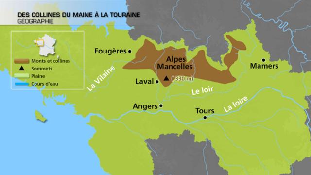 Aux confins de la Mayenne et de la Sarthe, le paysage est collineux, presqu'Ardennais : l'on est au bout des longues échines granitiques qui relient le massif Armoricain aux collines de Normandie, et qui culminent non loin d'Alençon (Mont des Avaloirs et Signal d'Ecouves, 417 m d'altitude, points culminants de l'ouest de la France). Entre Alençon et Le Mans, d'autres collines sont traversées par la vallée encaissée de la Sarthe et forment " les Alpes Mancelles ", dont le relief est assez escarpé. Enfin, au sud de ce massif, la forêt de Sillé le Guillaume culmine à 330 m.