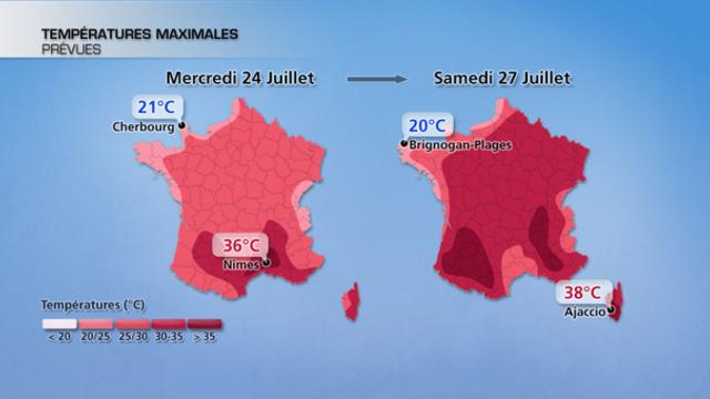 Entre vendredi et dimanche, une large moitié sud-est du pays connaîtra à nouveau des températures caniculaires. Les minimales resteront supérieures à 20°C, et dans l'après-midi, il fera souvent 34 à 38°C. La chaleur sera un peu plus tempérée en vallée de la Garonne avec le vent d'autan. Les brises souffleront également près de la Grande Bleue. En basse vallée du Rhône et en Corse, la chaleur sera vraiment extrême avec des pointes possibles à près de 40°C ce week-end. Le sirocco se mettra en place dans la région d'Ajaccio.