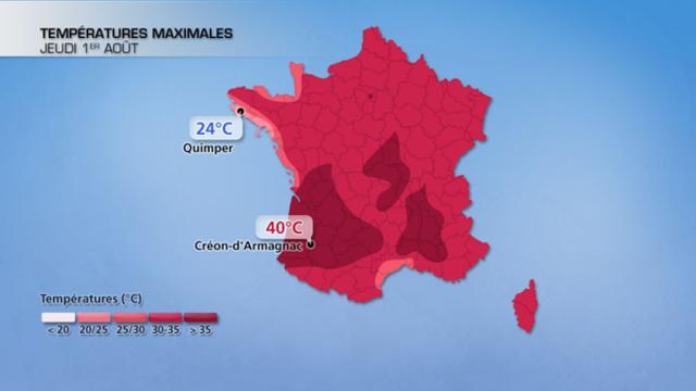 Dès le matin, les minimales ne seront plus aussi fraîches que ces derniers jours. Elles s'échelonneront de 15 à 25°C. Dans l'après-midi, rares seront les régions où l'on ne dépassera pas les 30°C. Elles se limiteront au sud de la Bretagne et au littoral languedocien, avec 25 à 29°C mais une forte humidité, si bien que le ressenti sera désagréable. Les 30°C seront dépassés sur l'ensemble des côtes de la Manche. On attend jusqu'à 35-36°C dans la capitale, et localement 40°C dans les plaines du sud-ouest. Ces valeurs se situent à 2-3°C des records pour la saison. (double carte : comparaison avec les valeurs atteintes en France lors de la canicule d'aout 2003).