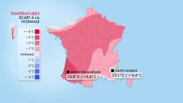 C'est dans le sud-ouest que l'excédent de températures est le plus marquée (3,4°C à Mont-de-Marsan) tandis qu'il est plus limité (de l'ordre de 1°C) près des côtes de la Manche et de la Méditerranée où les brises de mer ont limité la hausse des températures.