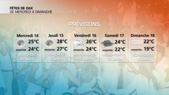 Retrouvez les prévisions météo pour Dax, sur votre téléphone, au 3201*