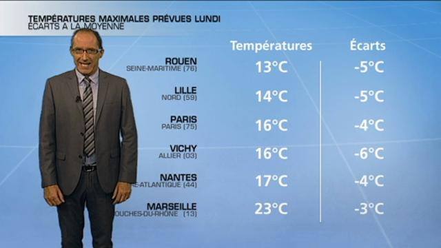 Avec un vent orienté au nord, il ne fait pas chaud ; l'après-midi, comptez avec des températures comprises entre 13°C à Dunkerque à 23°C en Corse, des valeurs inférieures de 5°C aux moyennes de saison et plus proche d'une mi-octobre...