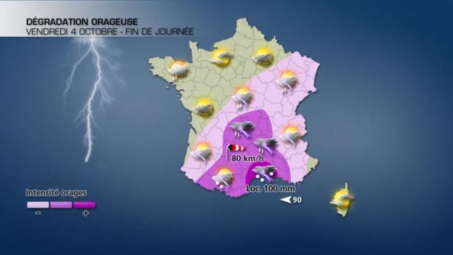 Après un court répit en début d'après-midi, de nouvelles cellules orageuses puissantes se développeront entre les Pyrénées, le Poitou-Charentes et le Pas-de-Calais en passant par la région Centre et l'Ile-de-France. Elles seront beaucoup plus fortes en soirée, avec de la grêle et des bourrasques de vent voisines de 80 à 90 km/h. Un communiqué spécial a été émis dans nos services. Les régions les plus exposées s'étendent de la Gironde au Poitou-Charentes et à la vallée de la Loire.