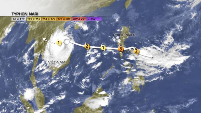 44 morts personnes, dont 7 français, ont perdu la vie dans le crash d'un avion ATR72 de la compagnie Lao Airlines. L'appareil aurait été confronté à des vents violents peu avant son atterrissage sur la piste de l'aéroport de Pakse, une grande cité touristique. Nari a frappé le nord de l'archipel des Philippines en catégorie 3 vendredi et samedi derniers, avec des vents compris entre 200 et 220 km/h et une houle cyclonique voisine de 5 à 6 m au large. En frappant la baie de Baler, un littoral assez vulnérable, de gros dégâts ont été constatés aussi bien au niveau des inondations (avec des pluies diluviennes, jusqu'à 300 mm avec 140 mm à Iba, 150 mm à Cabanatuan ou bien encore 115 mm à Casiguran ) que la surcote de l'ordre de 1m qui a accompagné ce typhon. En butant sur les reliefs, Nari a provoqué de nombreux glissements de terrain. La région de Manille a été également été touchée par de fortes pluies orageuses.
