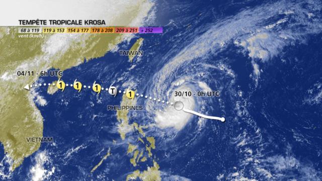 Krosa devrait en effet toucher le nord de l'archipel d'ici à la fin de semaine, au stade de tempête tropicale, voire de typhon de catégorie 1, avec de forts risques d'inondation, et des rafales pouvant déjà avoisiner les 140 km/h. C'est ultérieurement, au fil de sa progression en mer de Chine, que ce pourrait devenir un typhon de catégorie 1 ou 2. Le week-end prochain, la Chine ou le Vietnam pourraient alors se trouver en ligne de mire. La fiabilité de la prévision reste encore assez limitée.