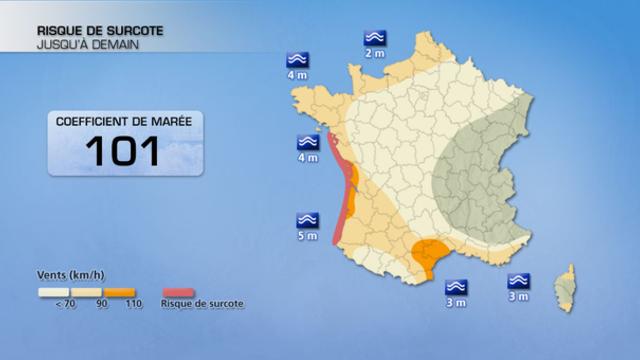 Ce sera surtout le cas entre les îles charentaises et le pays basque. Le temps y sera très maussade avec des pluies faibles à modérées, mais aussi des rafales de vent voisines de 70 km/h dans les terres, et jusqu'à 90-100 km/h en bord de mer. Au large, la houle sera encore voisine de 4 à 5 m, ce qui favorisera au moment des marées hautes (à 6h et 18h à Arcachon) un risque de légères submersions marines. La Garonne pourrait également déborder un peu.