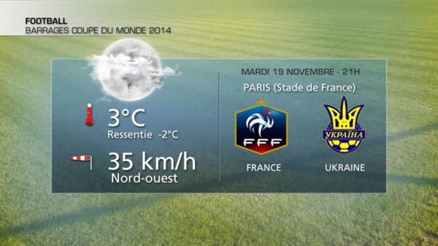 Côté météo, le temps sera presque aussi hivernal demain soir sur Paris que lors du match aller. Certes, le mercure affichera environ 3°C au moment du coup d'envoi, sans risque de gelées. Le ciel, nuageux au début du matin, se dégagera de plus en plus et le froid deviendra plus vif au fil de la partie. Le vent de nord soufflera également sensiblement, avec des pointes à 35 km/h. Dans ce contexte, le ressenti sera négatif, de l'ordre de -2 et identique à celui observé à Kiev.