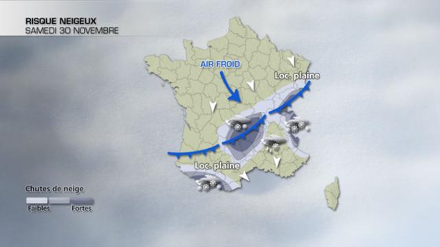 Ce soir, quelques chutes de pluie et neige mêlées sont à redouter en direction de la Lorraine ou de la Bourgogne, avec de la neige seule dès 400 m sur les premiers reliefs. Samedi matin, il neigera à nouveau sur le Massif Central et les Alpes, avec une dizaine de centimètres supplémentaires dès 500 m. Entre Lyon et Grenoble, la situation est à surveiller car la neige pourrait ponctuellement gagner la plaine, plutôt sur l'Isère.
