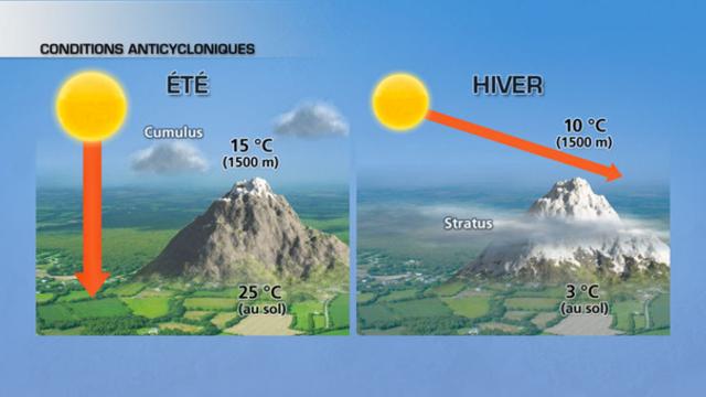 En montagne avec le phénomène d'inversion de températures la prévision des températures est particulièrement délicate. Dans le Puy-de-Dôme, il fait plus beaucoup plus doux ce matin à 1400 m d'altitude (7,3°C à Chastreix) que dans la plaine de la Limagne (-3°C à Clermont-Ferrand).