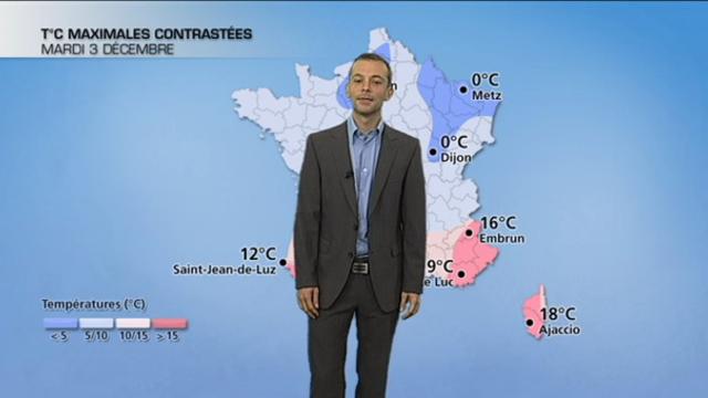 Comme la veille, on retrouvera de fréquents brouillards en matinée. Ils concernent surtout les régions situées sur un axe allant des Pays-de-la-Loire à la Lorraine ainsi que les plaines du sud-ouest. Attention, ils sont parfois givrants en début de journée avec des chaussées rendues glissantes en campagne. Au lever du jour on observait 100 m de visibilité à Chalons-en-Champagne, Orléans, Le Mans, Romorantin, Montauban, Agen, Toulouse et Albi, 200 m à Nancy, 400 m à Bordeaux et Blois. Des nuages bas tenaces concernent les régions du nord-ouest. En cours d'après-midi quelques petites bruines pourront se produire près du littoral de la Manche jusque sur le Nord-Pas-de-Calais. Des entrées maritimes concerneront le pays basque et le Béarn avec un ciel très nuageux à couvert. Sur le reste du pays, le soleil s'imposera plus facilement avec un beau temps froid et sec le matin, mais plus de douceur l'après-midi.