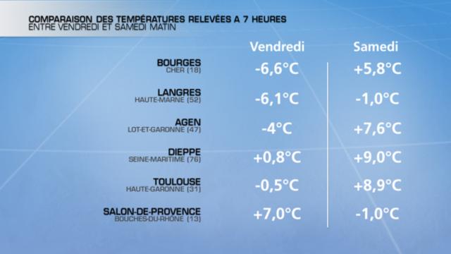 Ainsi, par endroit, on gagne plus de 10°C entre hier matin et ce samedi matin. Ainsi, à Bourges, on est passé de -5,8°C à +6,6°C. Même écart de température (+13°C) à Agen.