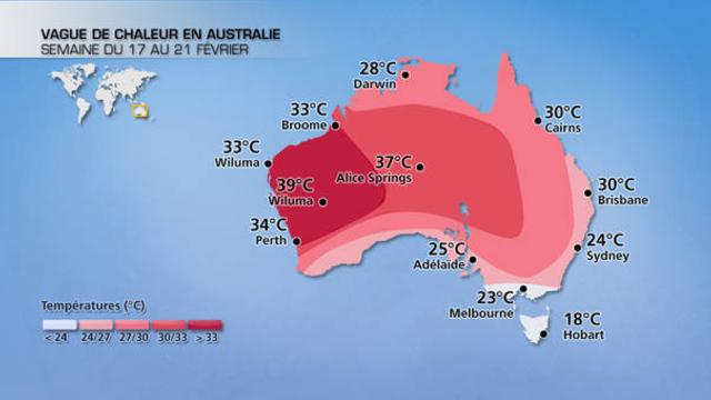 A noter que dans le reste du pays, la chaleur n’est pas aussi accablante, avec des valeurs proches de 30°C entre le nord (Darwin), le centre (Alice Springs) et l’est du pays (Brisbane), soit des valeurs dans les normes de saison. En allant vers le sud, (Melbourne, Sydney), on retrouve carrément des valeurs inférieures aux normes de saison, proches de 20°C, et le plus souvent accompagnées de conditions maussades alternant entre éclaircies et averses.