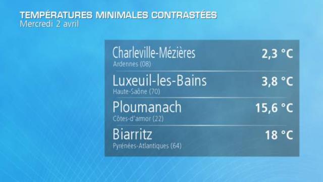 Les températures sont stables par rapport à la veille avec des minimales souvent comprises entre 5 et 15°C, du nord-est et du centre-est au Pays Basque. Les maximales sont également très élevées pour la saison, situées jusqu’à 8°C au-dessus des moyennes de saison. La barre des 20°C est atteinte quasiment partout, sauf près des rivages de la Méditerranée et de la Manche et jusqu’à 24°C dans le sud-ouest.