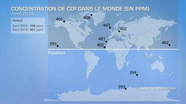 Dans l'hémisphère sud, ce taux de concentration n'est pas aussi élevé car il y a moins de surfaces continentales, donc moins de sources d'émissions de CO2 et sans doute une capacité supplémentaire des océans a en absorber. Mais, selon l'OMM, ce taux de 400 ppm pourrait être atteint au niveau planétaire dès 2015 ou 2016.