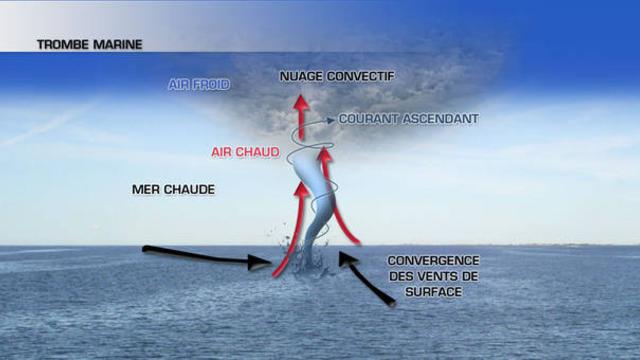 Une trombe marine est un phénomène météorologique de petite échelle correspondant à un tourbillon de vent s’étendant depuis la base d’un nuage convectif jusqu’à la mer. Ce tourbillon de vent prend la forme d’un entonnoir qui peut se développer jusqu’à atteindre la surface de la mer. La trombe arrive alors à maturité. Celle-ci, en balayant l’eau entraîne à sa base une excroissance bouillonnante, appelée « buisson » et constituée d’une nuée de gouttelettes au dessus de la mer. La trombe marine se forme par temps très instable, lorsque de l’air très froid en altitude surplombe de l’air chaud en surface.