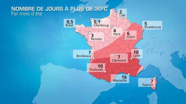 La barre des 30°C constitue un seuil qui est atteint ou dépassé en moyenne entre 3 et 5 jours à la fois en juillet et en août sur la plupart des agglomérations de la moitié nord comme Paris ou Strasbourg. Cependant, les coups de chauds sont quand même moins fréquents sur les côtes de la Manche où au cours de la journée de jeudi, on a atteint, voire dépasser les 30°C. En effet, dans cette configuration météorologique, la chaleur est transportée par un vent de terre d’est à sud-est jusque sur le littoral nord où les brises habituellement courantes ne se déclenchent pas et ne tempèrent pas la chaleur.