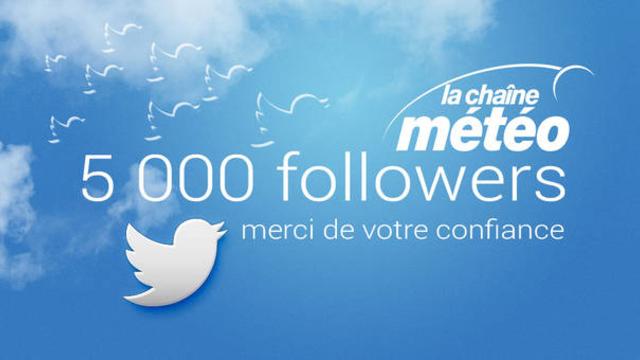La page Twitter de La Chaîne Météo a franchi le cap des 5000 abonnés ! En un clic "Suivre", informez-vous des conditions météo et de l'actualité climatique grâce à notre fils d'infos mis à jour tout au long de la journée par nos météorologues eux-mêmes.