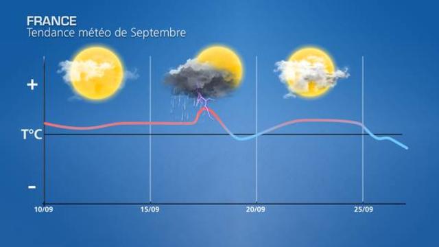 Nos prévisions saisonnières envisageaient globalement un mois de septembre plutôt beau et assez chaud sur la France. Cette tendance semble donc se vérifier jusqu'à maintenant. Pour ces prochains jours, nous allons rester dans une situation de blocage anticyclonique jusqu'au week-end avec un temps calme et sec. Si le soleil domine sans difficultés à l'ouest et au sud, des passages nuageux se produiront sur les régions du nord et de l'est. L'Alsace pourra même être concerné par quelques averses, en limite de la goutte froide d'altitude qui circulera sur l'Europe Centrale.
