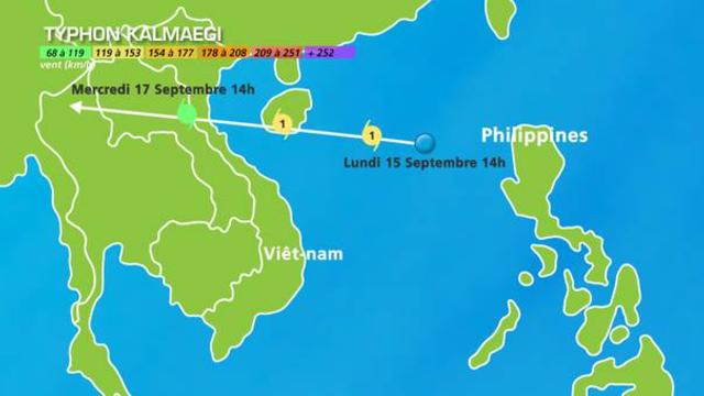 Dimanche, Kalmaegi est passé au rang de typhon de catégorie 1/5 (selon l'échelle de Saffir Simpson) à l’approche des côtes philippines, où ce phénomène a apporté de très fortes pluies et des vents violents (> à 150 km/h).